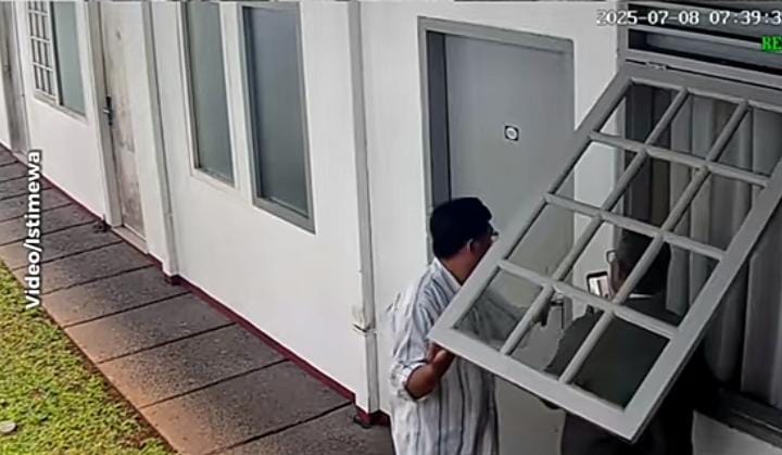 kamera CCTV menangkap penjaga kos yang berusaha masuk dengan mencongkel jendela kamar bersama seorang pria lain yang merekam kejadian.