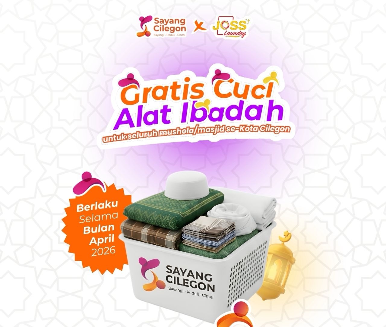 Kegiatan ini berkolaborasi dengan Joss Laundry, terbuka untuk se-Kota Cilegon tempat ibadah, baik mushola atau masjid. Adapun layanan yang diberikan meliputi pencucian, sajadah, mukena, sarung, peci dan berbagai perlengkapan ibadah lainnya secara gratis.